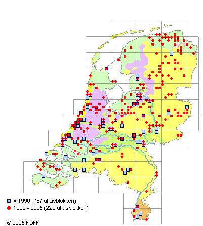 Het aantal atlasblokken (5x5 km) waarin de soort is gemeld binnen een periode van vijf jaar (vanaf 1980) of twintig jaar. Niet gecorrigeerd voor waarnemersinspanning en het aantal doorgegeven waarnemingen kan sterk variëren per periode, dus een trend in verspreiding kan hier niet direct uit worden afgelezen. Het opgegeven jaartal is het eerste jaar van de periode. Bron: gevalideerde waarnemingen uit de NDFF.