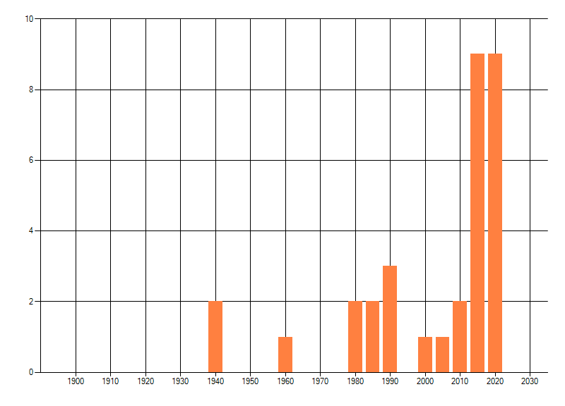 Het aantal atlasblokken (5x5 km) waarin de soort is gemeld binnen een periode van vijf jaar (vanaf 1980) of twintig jaar. Niet gecorrigeerd voor waarnemersinspanning en het aantal doorgegeven waarnemingen kan sterk variëren per periode, dus een trend in verspreiding kan hier niet direct uit worden afgelezen. Het opgegeven jaartal is het eerste jaar van de periode. Bron: gevalideerde waarnemingen uit de NDFF.