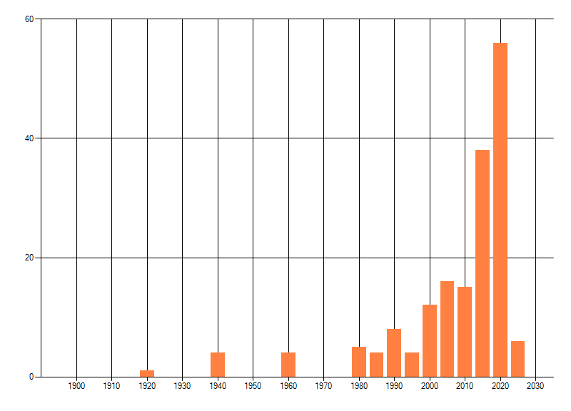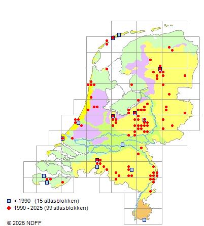Het aantal atlasblokken (5x5 km) waarin de soort is gemeld binnen een periode van vijf jaar (vanaf 1980) of twintig jaar. Niet gecorrigeerd voor waarnemersinspanning en het aantal doorgegeven waarnemingen kan sterk variëren per periode, dus een trend in verspreiding kan hier niet direct uit worden afgelezen. Het opgegeven jaartal is het eerste jaar van de periode. Bron: gevalideerde waarnemingen uit de NDFF.