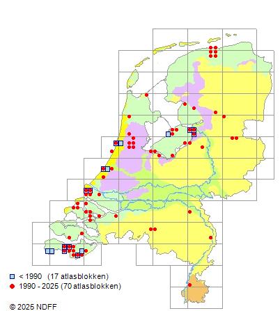 Het aantal atlasblokken (5x5 km) waarin de soort is gemeld binnen een periode van vijf jaar (vanaf 1980) of twintig jaar. Niet gecorrigeerd voor waarnemersinspanning en het aantal doorgegeven waarnemingen kan sterk variëren per periode, dus een trend in verspreiding kan hier niet direct uit worden afgelezen. Het opgegeven jaartal is het eerste jaar van de periode. Bron: gevalideerde waarnemingen uit de NDFF.