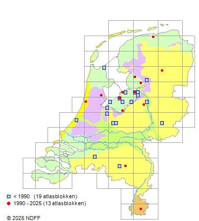 Het aantal atlasblokken (5x5 km) waarin de soort is gemeld binnen een periode van vijf jaar (vanaf 1980) of twintig jaar. Niet gecorrigeerd voor waarnemersinspanning en het aantal doorgegeven waarnemingen kan sterk variëren per periode, dus een trend in verspreiding kan hier niet direct uit worden afgelezen. Het opgegeven jaartal is het eerste jaar van de periode. Bron: gevalideerde waarnemingen uit de NDFF.