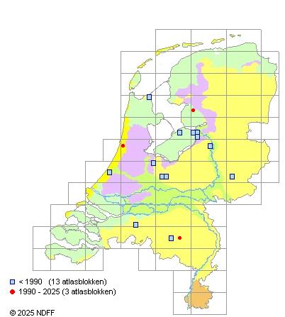 Vroeger zeld., vooral in Y en R, ook in P. Na 1980 alleen bekend van Santpoort (Duin en Kruidberg) en éénmaal bij Spier (Dr), 1991.