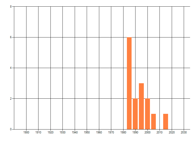 Het aantal atlasblokken (5x5 km) waarin de soort is gemeld binnen een periode van vijf jaar (vanaf 1980) of twintig jaar. Niet gecorrigeerd voor waarnemersinspanning en het aantal doorgegeven waarnemingen kan sterk variëren per periode, dus een trend in verspreiding kan hier niet direct uit worden afgelezen. Het opgegeven jaartal is het eerste jaar van de periode. Bron: gevalideerde waarnemingen uit de NDFF.