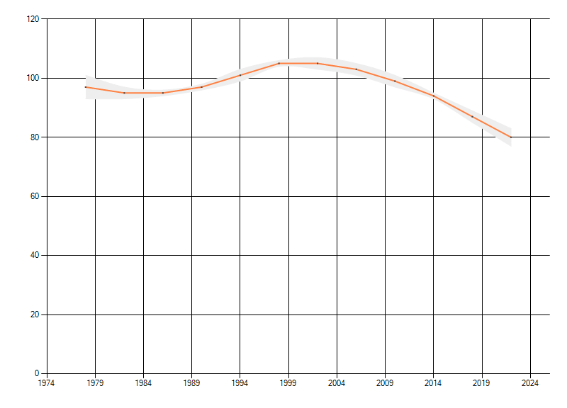 Gemiddelde trend van het aantal kilometerhokken waarin de soort voorkomt, weergegeven als indexcijfer (1975-1978 = 100).