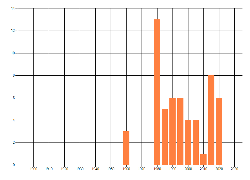 Het aantal atlasblokken (5x5 km) waarin de soort is gemeld binnen een periode van vijf jaar (vanaf 1980) of twintig jaar. Niet gecorrigeerd voor waarnemersinspanning en het aantal doorgegeven waarnemingen kan sterk variëren per periode, dus een trend in verspreiding kan hier niet direct uit worden afgelezen. Het opgegeven jaartal is het eerste jaar van de periode. Bron: gevalideerde waarnemingen uit de NDFF.