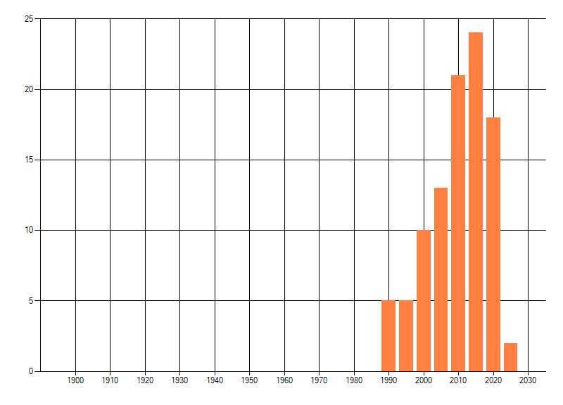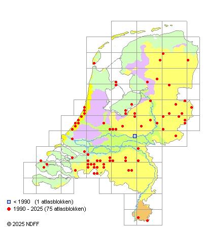 Het aantal atlasblokken (5x5 km) waarin de soort is gemeld binnen een periode van vijf jaar (vanaf 1980) of twintig jaar. Niet gecorrigeerd voor waarnemersinspanning en het aantal doorgegeven waarnemingen kan sterk variëren per periode, dus een trend in verspreiding kan hier niet direct uit worden afgelezen. Het opgegeven jaartal is het eerste jaar van de periode. Bron: gevalideerde waarnemingen uit de NDFF.