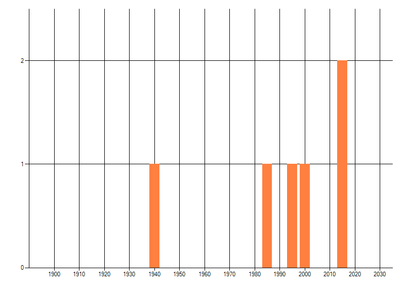 Het aantal atlasblokken (5x5 km) waarin de soort is gemeld binnen een periode van vijf jaar (vanaf 1980) of twintig jaar. Niet gecorrigeerd voor waarnemersinspanning en het aantal doorgegeven waarnemingen kan sterk variëren per periode, dus een trend in verspreiding kan hier niet direct uit worden afgelezen. Het opgegeven jaartal is het eerste jaar van de periode. Bron: gevalideerde waarnemingen uit de NDFF.