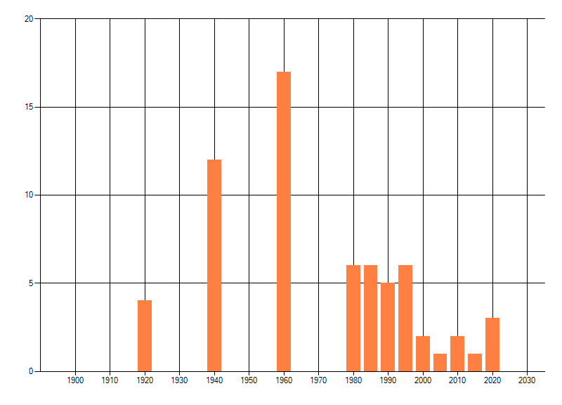 Het aantal atlasblokken (5x5 km) waarin de soort is gemeld binnen een periode van vijf jaar (vanaf 1980) of twintig jaar. Niet gecorrigeerd voor waarnemersinspanning en het aantal doorgegeven waarnemingen kan sterk variëren per periode, dus een trend in verspreiding kan hier niet direct uit worden afgelezen. Het opgegeven jaartal is het eerste jaar van de periode. Bron: gevalideerde waarnemingen uit de NDFF.
