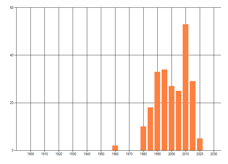 Het aantal atlasblokken (5x5 km) waarin de soort is gemeld binnen een periode van vijf jaar (vanaf 1980) of twintig jaar. Niet gecorrigeerd voor waarnemersinspanning en het aantal doorgegeven waarnemingen kan sterk variëren per periode, dus een trend in verspreiding kan hier niet direct uit worden afgelezen. Het opgegeven jaartal is het eerste jaar van de periode. Bron: gevalideerde waarnemingen uit de NDFF.