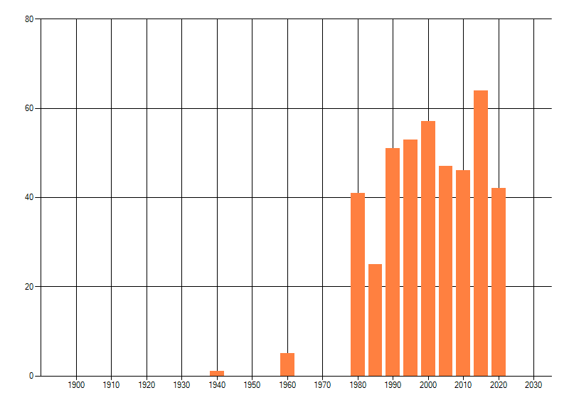 Het aantal atlasblokken (5x5 km) waarin de soort is gemeld binnen een periode van vijf jaar (vanaf 1980) of twintig jaar. Niet gecorrigeerd voor waarnemersinspanning en het aantal doorgegeven waarnemingen kan sterk variëren per periode, dus een trend in verspreiding kan hier niet direct uit worden afgelezen. Het opgegeven jaartal is het eerste jaar van de periode. Bron: gevalideerde waarnemingen uit de NDFF.