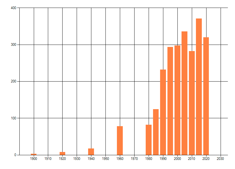 Het aantal atlasblokken (5x5 km) waarin de soort is gemeld binnen een periode van vijf jaar (vanaf 1980) of twintig jaar. Niet gecorrigeerd voor waarnemersinspanning en het aantal doorgegeven waarnemingen kan sterk variëren per periode, dus een trend in verspreiding kan hier niet direct uit worden afgelezen. Het opgegeven jaartal is het eerste jaar van de periode. Bron: gevalideerde waarnemingen uit de NDFF.