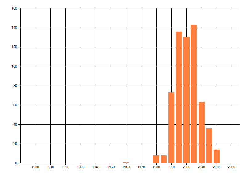 Het aantal atlasblokken (5x5 km) waarin de soort is gemeld binnen een periode van vijf jaar (vanaf 1980) of twintig jaar. Niet gecorrigeerd voor waarnemersinspanning en het aantal doorgegeven waarnemingen kan sterk variëren per periode, dus een trend in verspreiding kan hier niet direct uit worden afgelezen. Het opgegeven jaartal is het eerste jaar van de periode. Bron: gevalideerde waarnemingen uit de NDFF.