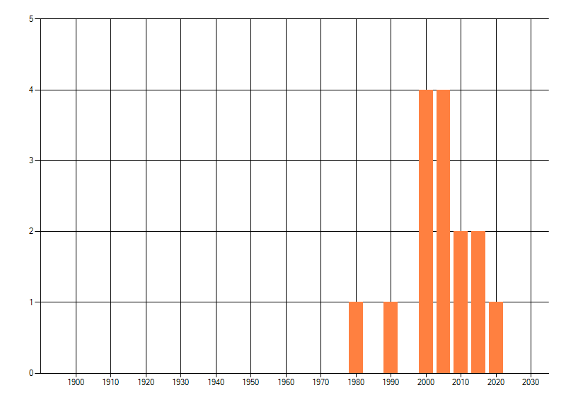 Het aantal atlasblokken (5x5 km) waarin de soort is gemeld binnen een periode van vijf jaar (vanaf 1980) of twintig jaar. Niet gecorrigeerd voor waarnemersinspanning en het aantal doorgegeven waarnemingen kan sterk variëren per periode, dus een trend in verspreiding kan hier niet direct uit worden afgelezen. Het opgegeven jaartal is het eerste jaar van de periode. Bron: gevalideerde waarnemingen uit de NDFF.