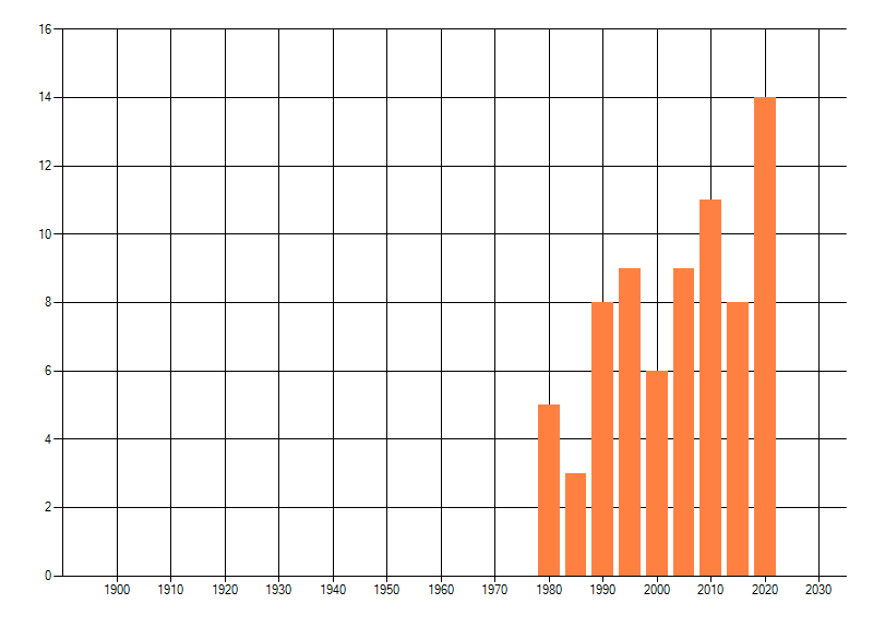 Het aantal atlasblokken (5x5 km) waarin de soort is gemeld binnen een periode van vijf jaar (vanaf 1980) of twintig jaar. Niet gecorrigeerd voor waarnemersinspanning en het aantal doorgegeven waarnemingen kan sterk variëren per periode, dus een trend in verspreiding kan hier niet direct uit worden afgelezen. Het opgegeven jaartal is het eerste jaar van de periode. Bron: gevalideerde waarnemingen uit de NDFF.