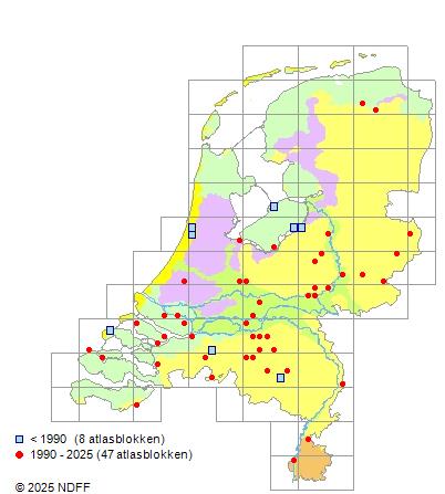 Het aantal atlasblokken (5x5 km) waarin de soort is gemeld binnen een periode van vijf jaar (vanaf 1980) of twintig jaar. Niet gecorrigeerd voor waarnemersinspanning en het aantal doorgegeven waarnemingen kan sterk variëren per periode, dus een trend in verspreiding kan hier niet direct uit worden afgelezen. Het opgegeven jaartal is het eerste jaar van de periode. Bron: gevalideerde waarnemingen uit de NDFF.