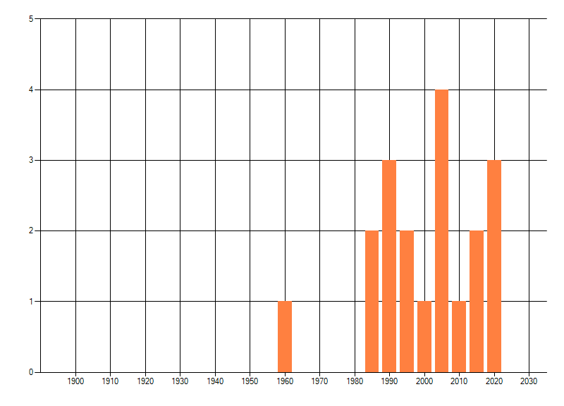 Het aantal atlasblokken (5x5 km) waarin de soort is gemeld binnen een periode van vijf jaar (vanaf 1980) of twintig jaar. Niet gecorrigeerd voor waarnemersinspanning en het aantal doorgegeven waarnemingen kan sterk variëren per periode, dus een trend in verspreiding kan hier niet direct uit worden afgelezen. Het opgegeven jaartal is het eerste jaar van de periode. Bron: gevalideerde waarnemingen uit de NDFF.