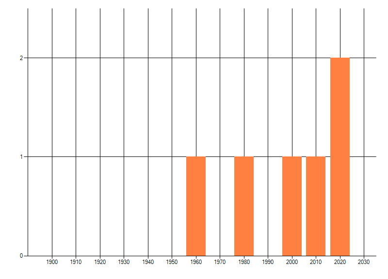 Het aantal atlasblokken (5x5 km) waarin de soort is gemeld binnen een periode van vijf jaar (vanaf 1980) of twintig jaar. Niet gecorrigeerd voor waarnemersinspanning en het aantal doorgegeven waarnemingen kan sterk variëren per periode, dus een trend in verspreiding kan hier niet direct uit worden afgelezen. Het opgegeven jaartal is het eerste jaar van de periode. Bron: gevalideerde waarnemingen uit de NDFF.