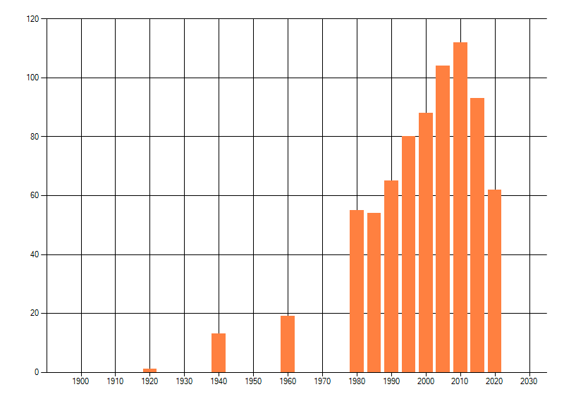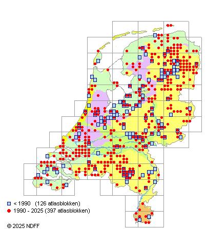 Het aantal atlasblokken (5x5 km) waarin de soort is gemeld binnen een periode van vijf jaar (vanaf 1980) of twintig jaar. Niet gecorrigeerd voor waarnemersinspanning en het aantal doorgegeven waarnemingen kan sterk variëren per periode, dus een trend in verspreiding kan hier niet direct uit worden afgelezen. Het opgegeven jaartal is het eerste jaar van de periode. Bron: gevalideerde waarnemingen uit de NDFF.