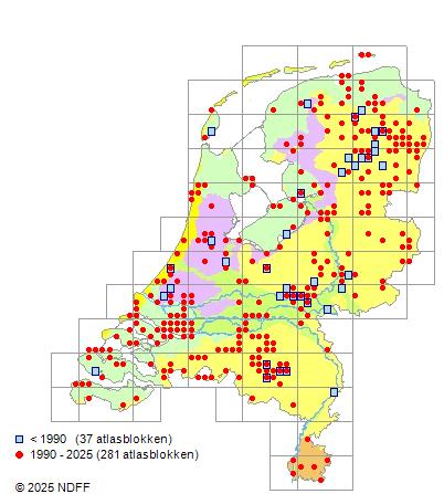 Het aantal atlasblokken (5x5 km) waarin de soort is gemeld binnen een periode van vijf jaar (vanaf 1980) of twintig jaar. Niet gecorrigeerd voor waarnemersinspanning en het aantal doorgegeven waarnemingen kan sterk variëren per periode, dus een trend in verspreiding kan hier niet direct uit worden afgelezen. Het opgegeven jaartal is het eerste jaar van de periode. Bron: gevalideerde waarnemingen uit de NDFF.