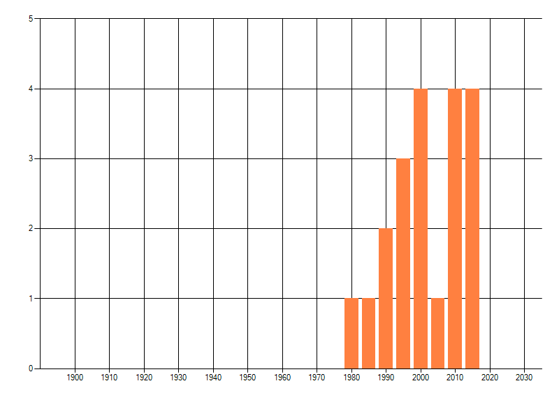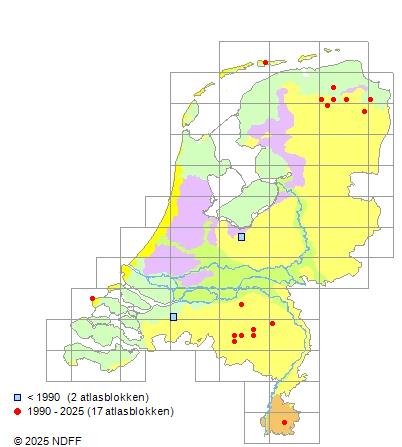 Het aantal atlasblokken (5x5 km) waarin de soort is gemeld binnen een periode van vijf jaar (vanaf 1980) of twintig jaar. Niet gecorrigeerd voor waarnemersinspanning en het aantal doorgegeven waarnemingen kan sterk variëren per periode, dus een trend in verspreiding kan hier niet direct uit worden afgelezen. Het opgegeven jaartal is het eerste jaar van de periode. Bron: gevalideerde waarnemingen uit de NDFF.