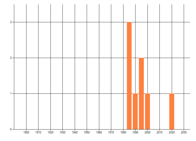 Het aantal atlasblokken (5x5 km) waarin de soort is gemeld binnen een periode van vijf jaar (vanaf 1980) of twintig jaar. Niet gecorrigeerd voor waarnemersinspanning en het aantal doorgegeven waarnemingen kan sterk variëren per periode, dus een trend in verspreiding kan hier niet direct uit worden afgelezen. Het opgegeven jaartal is het eerste jaar van de periode. Bron: gevalideerde waarnemingen uit de NDFF.