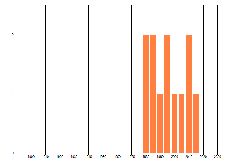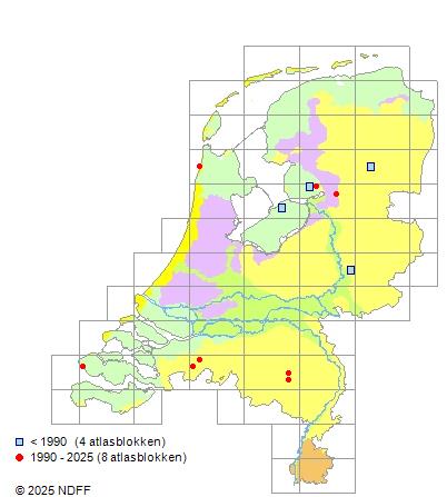 Het aantal atlasblokken (5x5 km) waarin de soort is gemeld binnen een periode van vijf jaar (vanaf 1980) of twintig jaar. Niet gecorrigeerd voor waarnemersinspanning en het aantal doorgegeven waarnemingen kan sterk variëren per periode, dus een trend in verspreiding kan hier niet direct uit worden afgelezen. Het opgegeven jaartal is het eerste jaar van de periode. Bron: gevalideerde waarnemingen uit de NDFF.