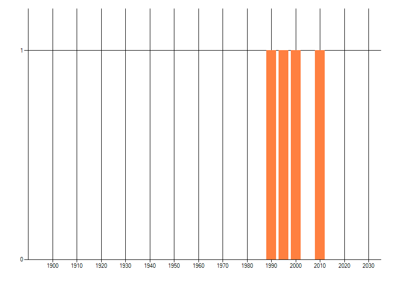 Het aantal atlasblokken (5x5 km) waarin de soort is gemeld binnen een periode van vijf jaar (vanaf 1980) of twintig jaar. Niet gecorrigeerd voor waarnemersinspanning en het aantal doorgegeven waarnemingen kan sterk variëren per periode, dus een trend in verspreiding kan hier niet direct uit worden afgelezen. Het opgegeven jaartal is het eerste jaar van de periode. Bron: gevalideerde waarnemingen uit de NDFF.