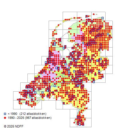 Het aantal atlasblokken (5x5 km) waarin de soort is gemeld binnen een periode van vijf jaar (vanaf 1980) of twintig jaar. Niet gecorrigeerd voor waarnemersinspanning en het aantal doorgegeven waarnemingen kan sterk variëren per periode, dus een trend in verspreiding kan hier niet direct uit worden afgelezen. Het opgegeven jaartal is het eerste jaar van de periode. Bron: gevalideerde waarnemingen uit de NDFF.