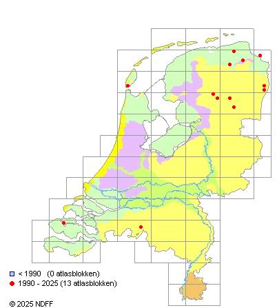 Het aantal atlasblokken (5x5 km) waarin de soort is gemeld binnen een periode van vijf jaar (vanaf 1980) of twintig jaar. Niet gecorrigeerd voor waarnemersinspanning en het aantal doorgegeven waarnemingen kan sterk variëren per periode, dus een trend in verspreiding kan hier niet direct uit worden afgelezen. Het opgegeven jaartal is het eerste jaar van de periode. Bron: gevalideerde waarnemingen uit de NDFF.