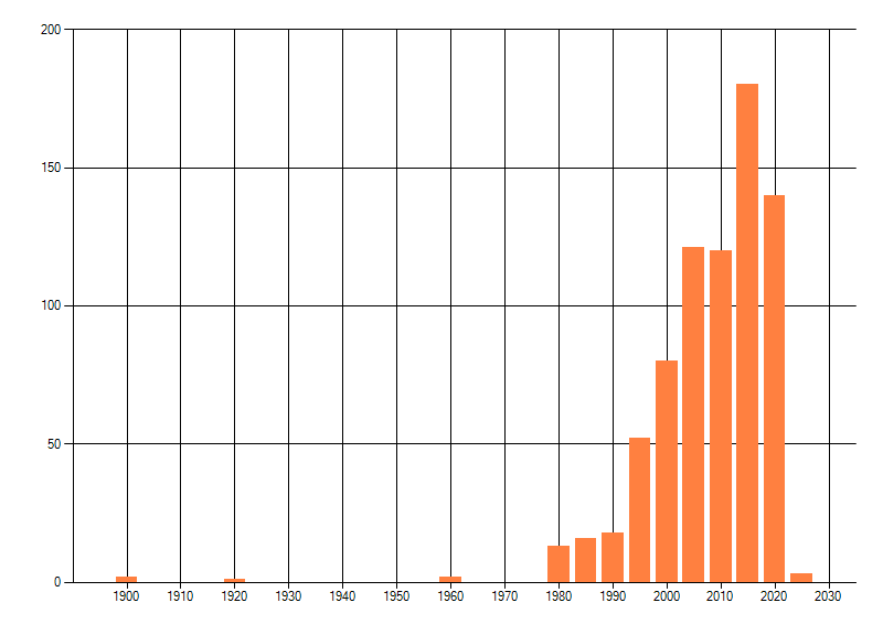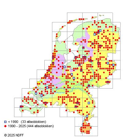 Het aantal atlasblokken (5x5 km) waarin de soort is gemeld binnen een periode van vijf jaar (vanaf 1980) of twintig jaar. Niet gecorrigeerd voor waarnemersinspanning en het aantal doorgegeven waarnemingen kan sterk variëren per periode, dus een trend in verspreiding kan hier niet direct uit worden afgelezen. Het opgegeven jaartal is het eerste jaar van de periode. Bron: gevalideerde waarnemingen uit de NDFF.