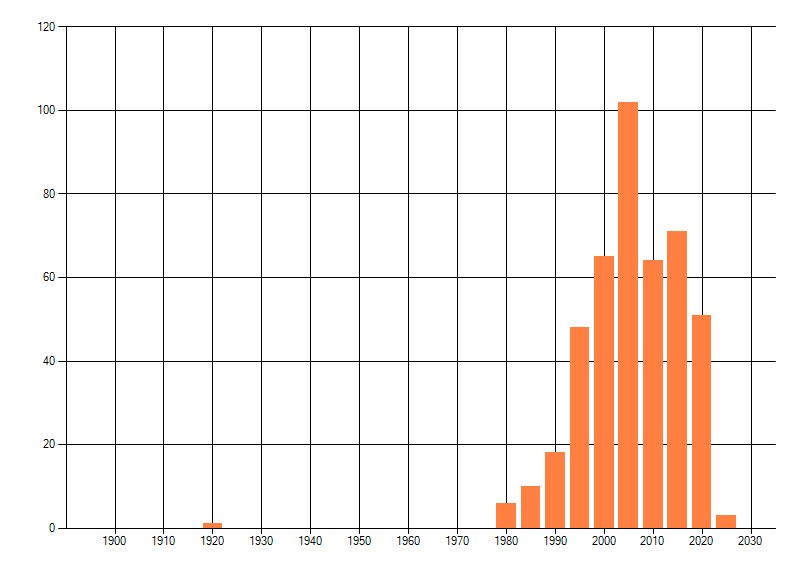 Het aantal atlasblokken (5x5 km) waarin de soort is gemeld binnen een periode van vijf jaar (vanaf 1980) of twintig jaar. Niet gecorrigeerd voor waarnemersinspanning en het aantal doorgegeven waarnemingen kan sterk variëren per periode, dus een trend in verspreiding kan hier niet direct uit worden afgelezen. Het opgegeven jaartal is het eerste jaar van de periode. Bron: gevalideerde waarnemingen uit de NDFF.
