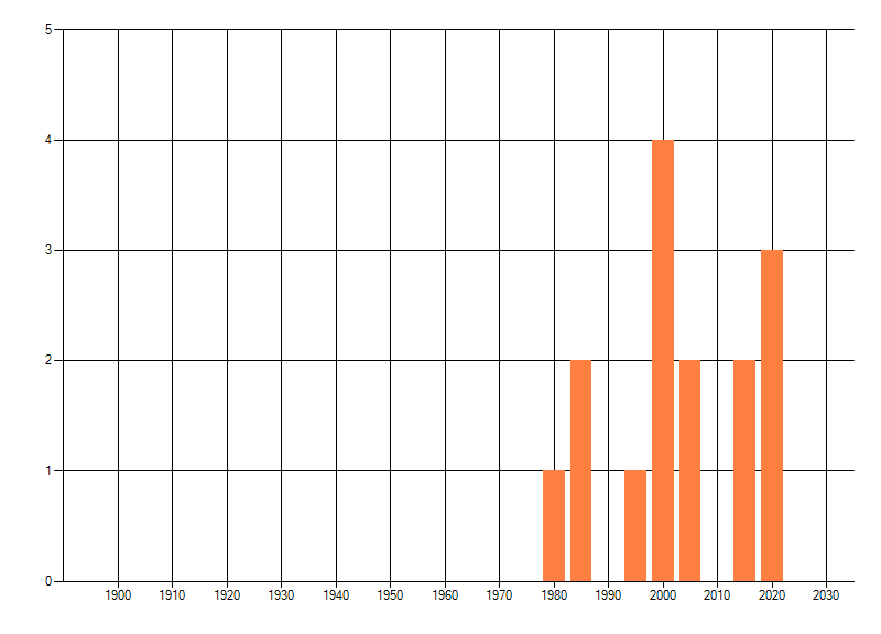 Het aantal atlasblokken (5x5 km) waarin de soort is gemeld binnen een periode van vijf jaar (vanaf 1980) of twintig jaar. Niet gecorrigeerd voor waarnemersinspanning en het aantal doorgegeven waarnemingen kan sterk variëren per periode, dus een trend in verspreiding kan hier niet direct uit worden afgelezen. Het opgegeven jaartal is het eerste jaar van de periode. Bron: gevalideerde waarnemingen uit de NDFF.