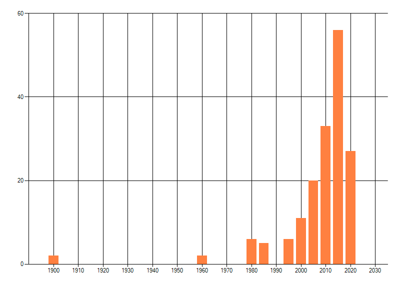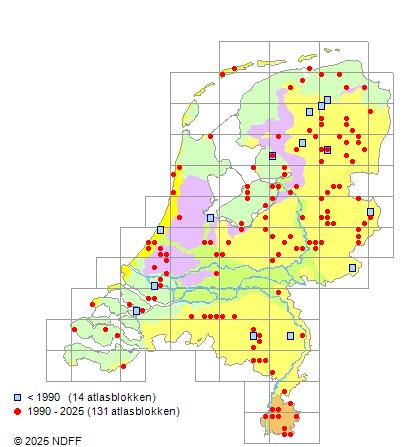 Het aantal atlasblokken (5x5 km) waarin de soort is gemeld binnen een periode van vijf jaar (vanaf 1980) of twintig jaar. Niet gecorrigeerd voor waarnemersinspanning en het aantal doorgegeven waarnemingen kan sterk variëren per periode, dus een trend in verspreiding kan hier niet direct uit worden afgelezen. Het opgegeven jaartal is het eerste jaar van de periode. Bron: gevalideerde waarnemingen uit de NDFF.