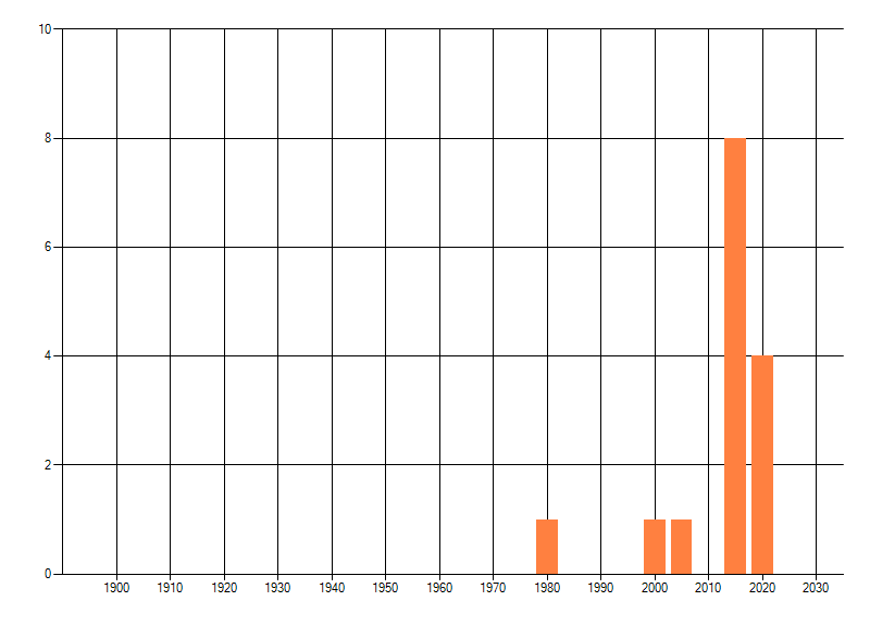 Het aantal atlasblokken (5x5 km) waarin de soort is gemeld binnen een periode van vijf jaar (vanaf 1980) of twintig jaar. Niet gecorrigeerd voor waarnemersinspanning en het aantal doorgegeven waarnemingen kan sterk variëren per periode, dus een trend in verspreiding kan hier niet direct uit worden afgelezen. Het opgegeven jaartal is het eerste jaar van de periode. Bron: gevalideerde waarnemingen uit de NDFF.