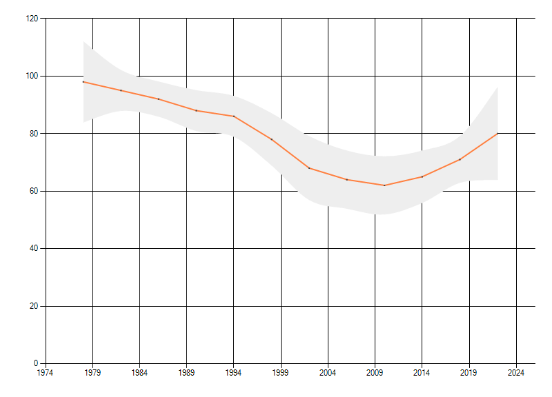 Gemiddelde trend van het aantal kilometerhokken waarin de soort voorkomt, weergegeven als indexcijfer (1975-1978 = 100). De trend is gecorrigeerd voor waarnemersinspanning en geeft de relatieve verandering in het aantal bezette kilometerhokken weer. Voor de berekening worden de data per periode van vier jaar samengenomen. In de grafiek correspondeert ieder punt met het laatste jaar van zo'n periode.