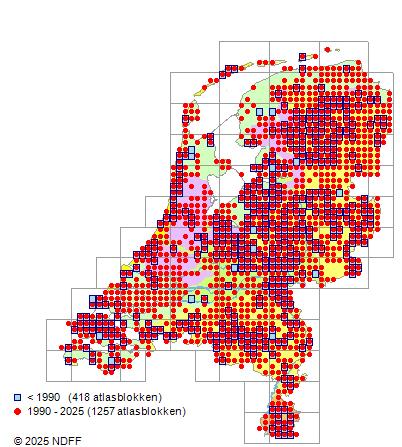 Het aantal atlasblokken (5x5 km) waarin de soort is gemeld binnen een periode van vijf jaar (vanaf 1980) of twintig jaar. Niet gecorrigeerd voor waarnemersinspanning en het aantal doorgegeven waarnemingen kan sterk variëren per periode, dus een trend in verspreiding kan hier niet direct uit worden afgelezen. Het opgegeven jaartal is het eerste jaar van de periode. Bron: gevalideerde waarnemingen uit de NDFF.