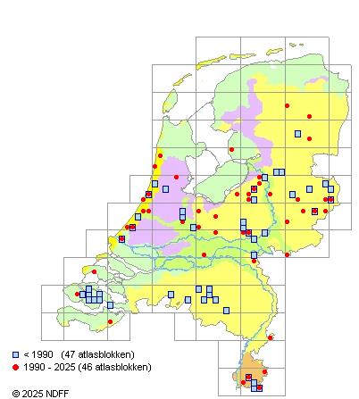 Het aantal atlasblokken (5x5 km) waarin de soort is gemeld binnen een periode van vijf jaar (vanaf 1980) of twintig jaar.
