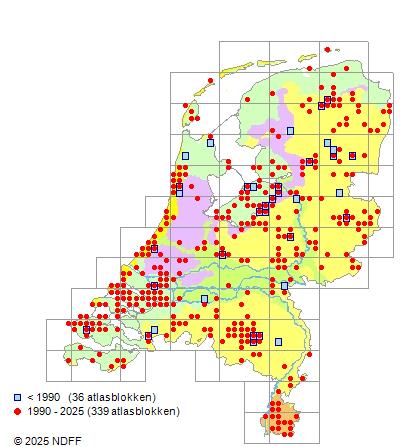 Het aantal atlasblokken (5x5 km) waarin de soort is gemeld binnen een periode van vijf jaar (vanaf 1980) of twintig jaar. Niet gecorrigeerd voor waarnemersinspanning en het aantal doorgegeven waarnemingen kan sterk variëren per periode, dus een trend in verspreiding kan hier niet direct uit worden afgelezen. Het opgegeven jaartal is het eerste jaar van de periode. Bron: gevalideerde waarnemingen uit de NDFF.