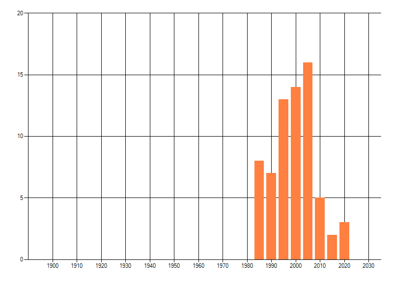 Het aantal atlasblokken (5x5 km) waarin de soort is gemeld binnen een periode van vijf jaar (vanaf 1980) of twintig jaar.