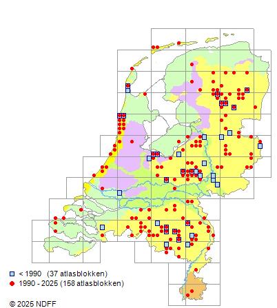 Het aantal atlasblokken (5x5 km) waarin de soort is gemeld binnen een periode van vijf jaar (vanaf 1980) of twintig jaar. Niet gecorrigeerd voor waarnemersinspanning en het aantal doorgegeven waarnemingen kan sterk variëren per periode, dus een trend in verspreiding kan hier niet direct uit worden afgelezen. Het opgegeven jaartal is het eerste jaar van de periode. Bron: gevalideerde waarnemingen uit de NDFF.