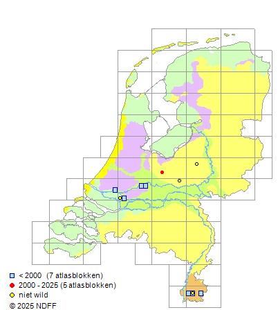 Het aantal atlasblokken (5x5 km) waarin de soort is gemeld binnen een periode van vijf jaar (vanaf 1980) of twintig jaar. Niet gecorrigeerd voor waarnemersinspanning en het aantal doorgegeven waarnemingen kan sterk variëren per periode, dus een trend in verspreiding kan hier niet direct uit worden afgelezen. Het opgegeven jaartal is het eerste jaar van de periode. Bron: gevalideerde waarnemingen uit de NDFF.