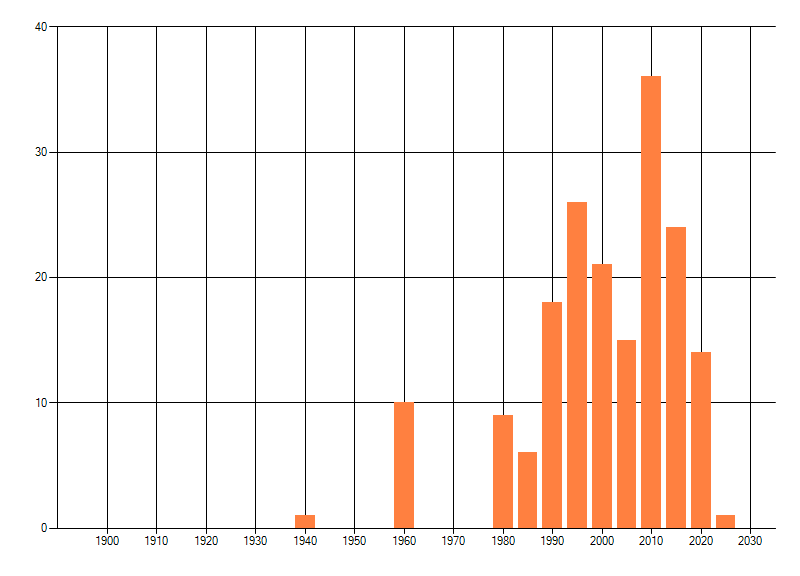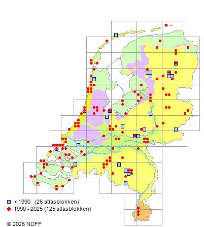 Het aantal atlasblokken (5x5 km) waarin de soort is gemeld binnen een periode van vijf jaar (vanaf 1980) of twintig jaar. Niet gecorrigeerd voor waarnemersinspanning en het aantal doorgegeven waarnemingen kan sterk variëren per periode, dus een trend in verspreiding kan hier niet direct uit worden afgelezen. Het opgegeven jaartal is het eerste jaar van de periode. Bron: gevalideerde waarnemingen uit de NDFF.