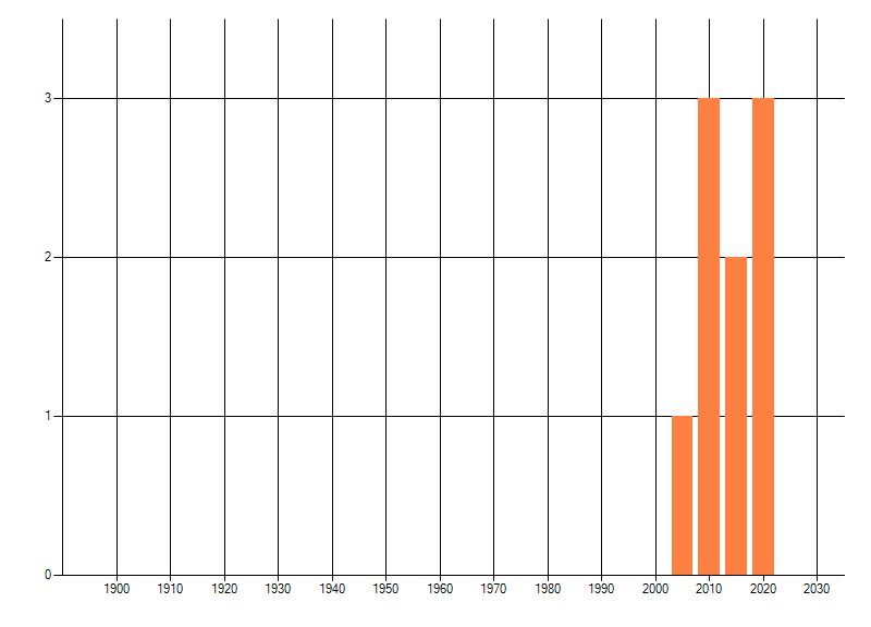 Het aantal atlasblokken (5x5 km) waarin de soort is gemeld binnen een periode van vijf jaar (vanaf 1980) of twintig jaar. Niet gecorrigeerd voor waarnemersinspanning en het aantal doorgegeven waarnemingen kan sterk variëren per periode, dus een trend in verspreiding kan hier niet direct uit worden afgelezen. Het opgegeven jaartal is het eerste jaar van de periode. Bron: gevalideerde waarnemingen uit de NDFF.