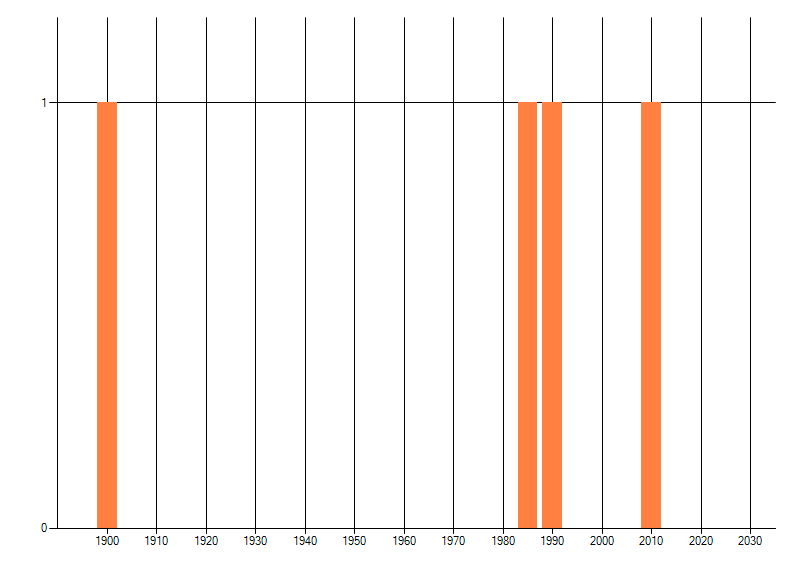 Het aantal atlasblokken (5x5 km) waarin de soort is gemeld binnen een periode van vijf jaar (vanaf 1980) of twintig jaar. Niet gecorrigeerd voor waarnemersinspanning en het aantal doorgegeven waarnemingen kan sterk variëren per periode, dus een trend in verspreiding kan hier niet direct uit worden afgelezen. Het opgegeven jaartal is het eerste jaar van de periode. Bron: gevalideerde waarnemingen uit de NDFF.