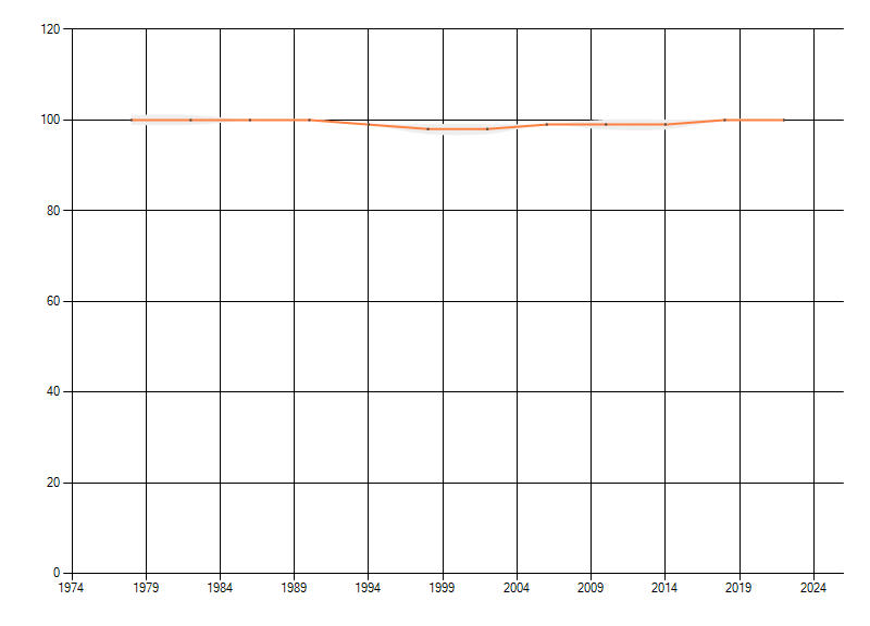 Gemiddelde trend van het aantal kilometerhokken waarin de soort voorkomt, weergegeven als indexcijfer (1975-1978 = 100).