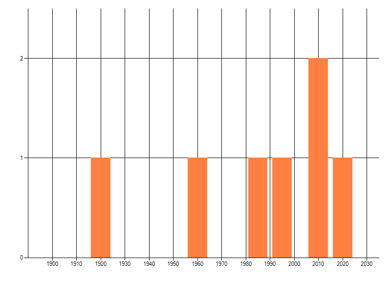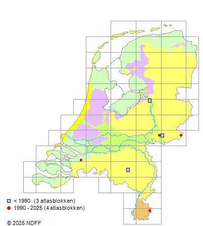 Het aantal atlasblokken (5x5 km) waarin de soort is gemeld binnen een periode van vijf jaar (vanaf 1980) of twintig jaar. Niet gecorrigeerd voor waarnemersinspanning en het aantal doorgegeven waarnemingen kan sterk variëren per periode, dus een trend in verspreiding kan hier niet direct uit worden afgelezen. Het opgegeven jaartal is het eerste jaar van de periode. Bron: gevalideerde waarnemingen uit de NDFF.