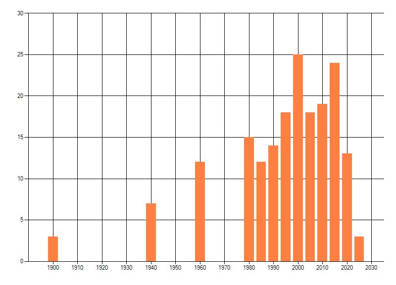 Het aantal atlasblokken (5x5 km) waarin de soort is gemeld binnen een periode van vijf jaar (vanaf 1980) of twintig jaar. Niet gecorrigeerd voor waarnemersinspanning en het aantal doorgegeven waarnemingen kan sterk variëren per periode, dus een trend in verspreiding kan hier niet direct uit worden afgelezen. Het opgegeven jaartal is het eerste jaar van de periode. Bron: gevalideerde waarnemingen uit de NDFF.
