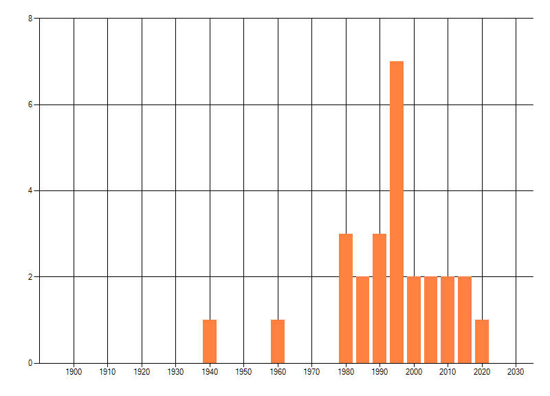Het aantal atlasblokken (5x5 km) waarin de soort is gemeld binnen een periode van vijf jaar (vanaf 1980) of twintig jaar. Niet gecorrigeerd voor waarnemersinspanning en het aantal doorgegeven waarnemingen kan sterk variëren per periode, dus een trend in verspreiding kan hier niet direct uit worden afgelezen. Het opgegeven jaartal is het eerste jaar van de periode. Bron: gevalideerde waarnemingen uit de NDFF.