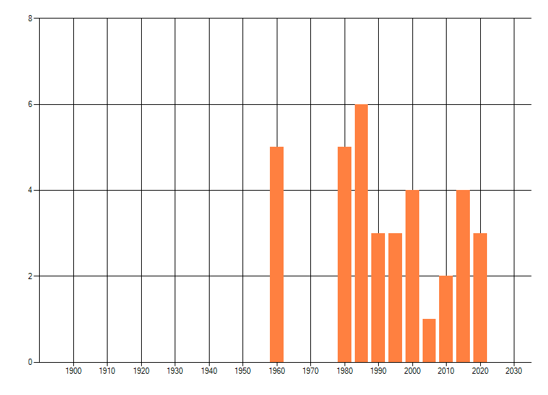 Het aantal atlasblokken (5x5 km) waarin de soort is gemeld binnen een periode van vijf jaar (vanaf 1980) of twintig jaar. Niet gecorrigeerd voor waarnemersinspanning en het aantal doorgegeven waarnemingen kan sterk variëren per periode, dus een trend in verspreiding kan hier niet direct uit worden afgelezen. Het opgegeven jaartal is het eerste jaar van de periode. Bron: gevalideerde waarnemingen uit de NDFF.