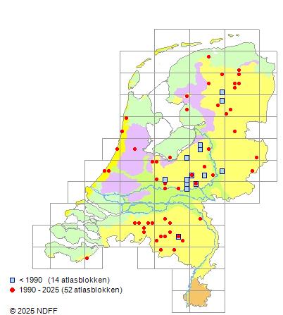 Het aantal atlasblokken (5x5 km) waarin de soort is gemeld binnen een periode van vijf jaar (vanaf 1980) of twintig jaar. Niet gecorrigeerd voor waarnemersinspanning en het aantal doorgegeven waarnemingen kan sterk variëren per periode, dus een trend in verspreiding kan hier niet direct uit worden afgelezen. Het opgegeven jaartal is het eerste jaar van de periode. Bron: gevalideerde waarnemingen uit de NDFF.